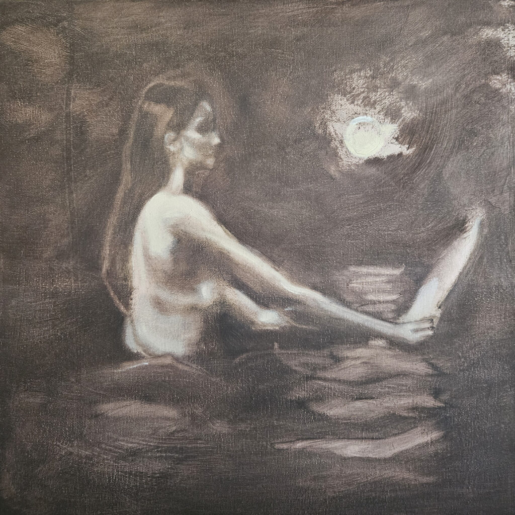 My work seeks the mythic within the modern. The female form serves as vessel and apparition: surfers become contemporary Venuses, skeletons shadow maidens in dialogues of vanity and death, and atmospheric backdrops of sea and storm sculpt space like living entities.